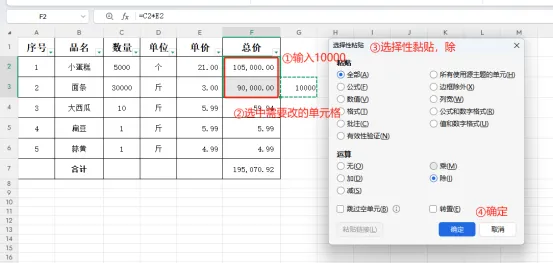 ①空白单元格输入10000,②ctrl+c复制10000,③鼠标右键选择性粘贴,选择除④确定。