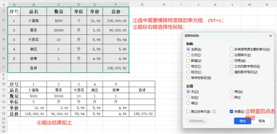①选中需要横排转竖排的单元格,②ctrl+c;③鼠标右键选择性粘贴,选择转置;④确定。