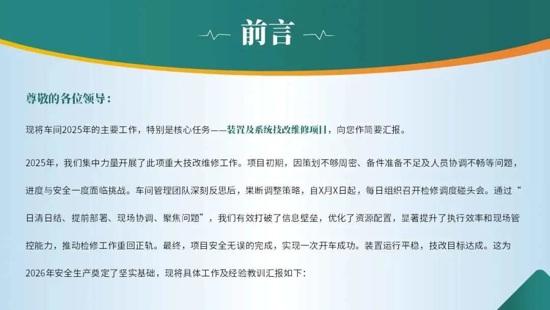 这次给各位老师带来一款我之前做的一个案例--车间主任年终总结述职报告PPT,有从事生产管理、车间管理、产线管理、班组长、车间主任、生产部经理等相关工作岗位的都可以参考借鉴一下!需要代做PPT的老师可以联系我,文章结尾有联系方式!车间主任年终总结述职报告PPT部分页面展示如下: