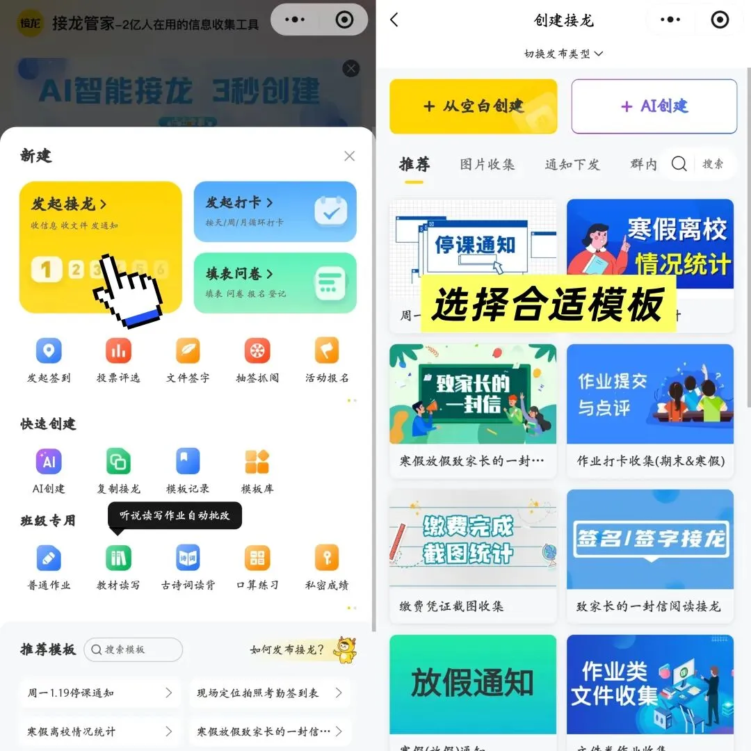 其实,接龙也能变专业!今天就教你个 “智能接龙” 的方法 —— 用「接龙管家」小程序。它不仅保留了传统接龙的方便,还能把所有数据自动导出成 Excel,整理数据再也不用手忙脚乱!用接龙管家发接龙,和微信自带接龙一样好上手:搜 “接龙管家”,点黄色图标,点 “+” 就能发起。不想自己写?用 AI 创建功能,输入你想要的内容(比如 “爬山报名接龙,需填姓名 + 电话”),30 秒自动生成,不满意还能重改,效率直接拉满!要是有现成需求,还能搜模板 —— 爬山报名、照片收集、作业统计…… 各种主题的模板都能免费用。没合适模板也不怕,从空白创建,填标题、写要求,加图片或文本项,点发布就能发群里。群友点链接直接填,30 秒搞定,再也不用在群里刷屏复制,聊天记录清清爽爽。02 能收图片视频文件,接龙需求全满足