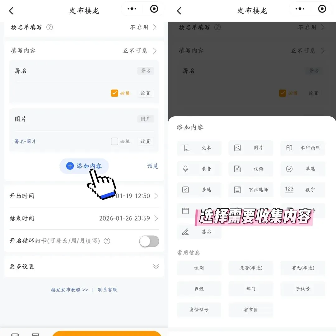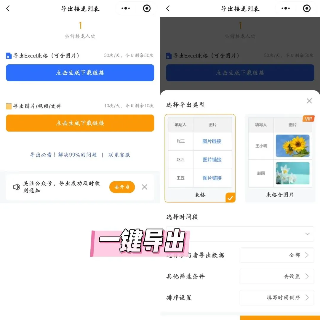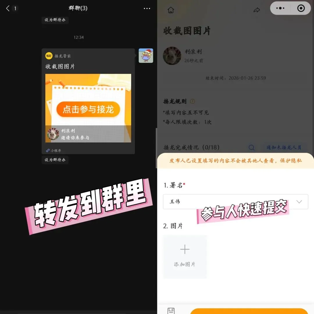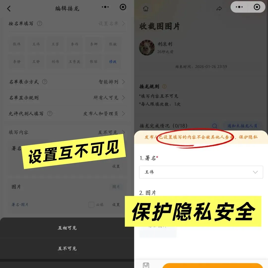 班级群、活动群发接龙,成员是固定的?接龙管家的 “按名单填写” 功能超实用!提前把成员名单录进去,大家点名单就能填信息,填完名字会变亮。谁接龙了、谁没接龙,看一眼名单就清楚,再也不用一个个去问 “XX 填了没”。传统接龙最头疼的就是隐私问题 —— 手机号、身份证号、家庭地址全暴露在群里,谁都能看到。用接龙管家发接龙,能开 “内容互不可见”,只有你(发布人)能看收集到的信息,其他人根本看不到,安全又放心!05 数据自动汇总,一键导出 Excel / 压缩包最省心的是,接龙管家能把收集到的文字、图片、文件自动汇总。想整理数据?点 “导出”,选 Excel 或压缩包格式,秒生成!导出的文件还能自动命名(比如 “爬山报名 202508”),不用手动改文件名,整理数据效率直接翻倍!不管是活动报名、工作日报、作业打卡,还是收个人信息,接龙管家都能搞定!累计发了 1.7 亿 + 条接龙,2025 年接龙类工具排名第一 —— 接龙麻烦?用接龙管家就对了!