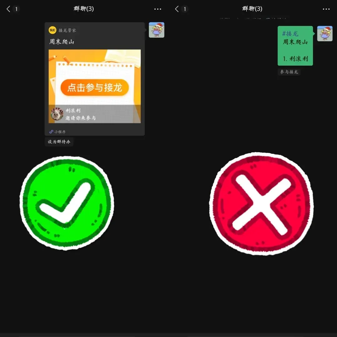 “家长们,游学报名请回复‘姓名 + 人数’……”“周六爬山活动,参加的朋友接龙报个名……”消息一出现,群里立刻被各种回复刷屏,和聊天记录混在一起,根本分不清谁是谁;