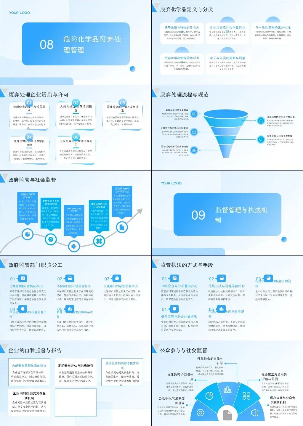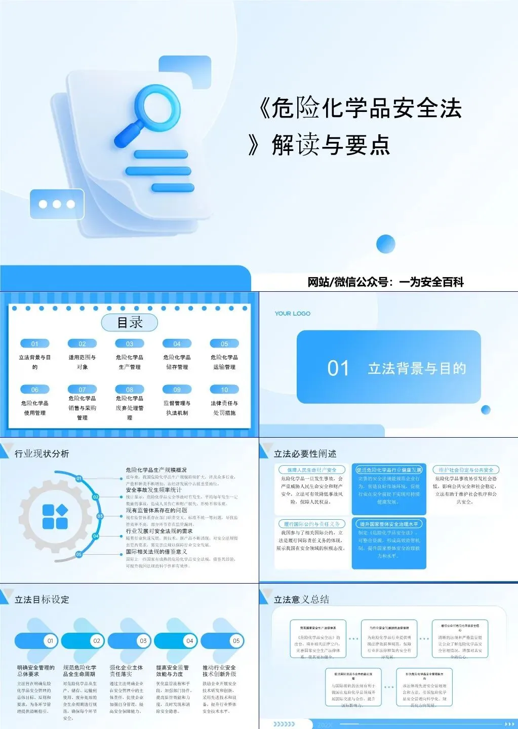 该PPT文档系统性地解读了《危险化学品安全法》的核心内容,旨在为相关从业者和公众提供全面的法规要点概览。全文共分为十个主要部分: