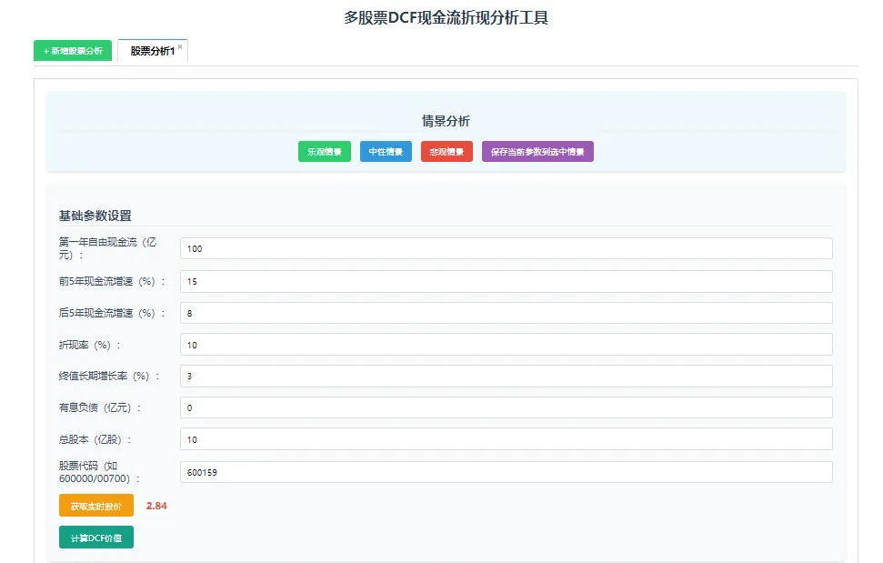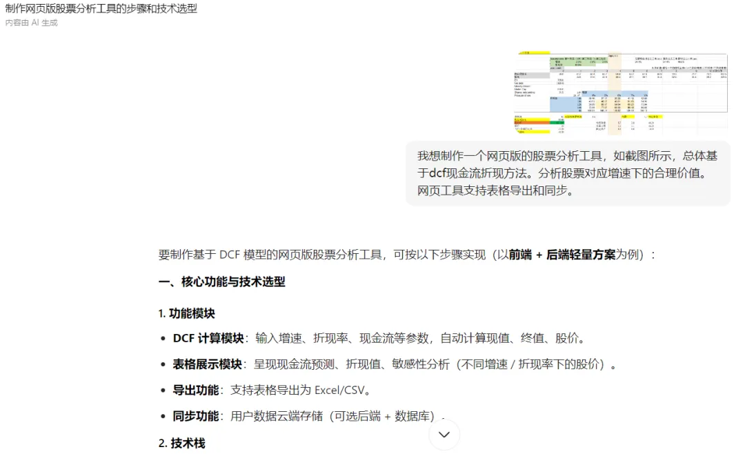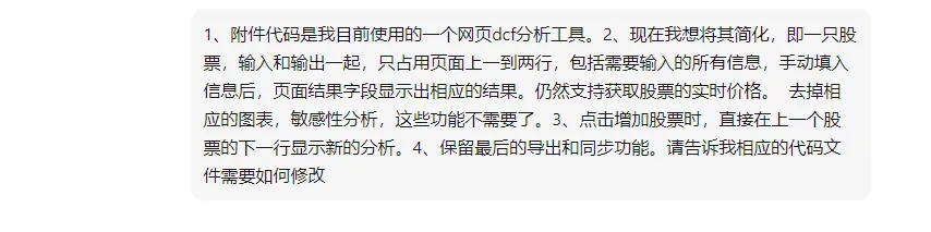 步骤也很简单,之前用豆包比较多,就直接把原来的Excel表格甩给他。经过几次调试,得到了这样一个网页版工具,基本满足了我的要求。但是用起来发现,这个页面适合做个股的深度分析。要是多只股票简单一览的话,还是不够简洁。于是告诉AI:又经过几次调试,得到了下面这样一个新的网页版工具:现在每次想要查看自己关注的股票DCF估值情况,只要一键点击“同步全部股价”,所有的信息扑面而来。几个源文件很小,也不用担心迁移问题。一键复制即可。