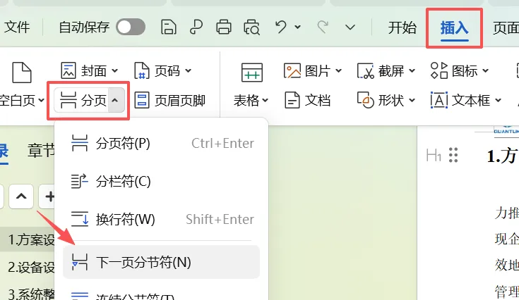 2、正本部分首页设置分节符:鼠标点击到正文部分的首页的第一个文本内容前,在顶部菜单栏点击【