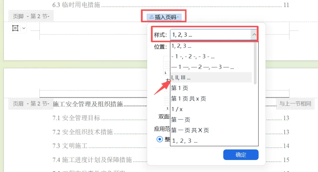 (2)目录页码单独编排,采用罗马数字(如 Ⅰ、Ⅱ、Ⅲ);