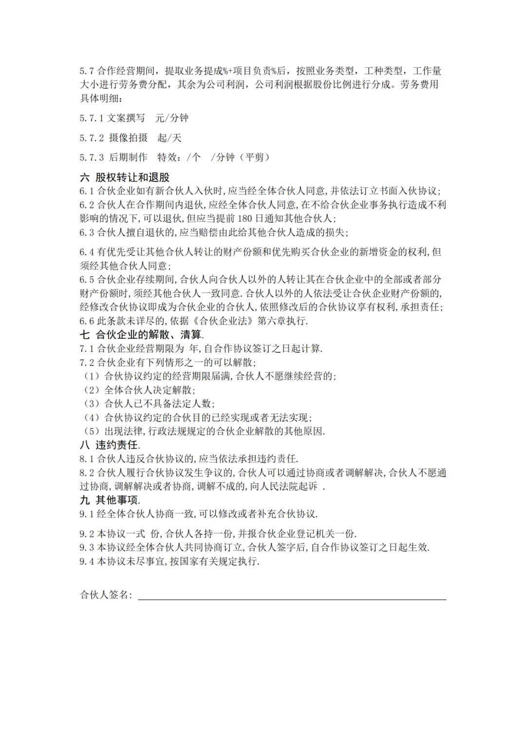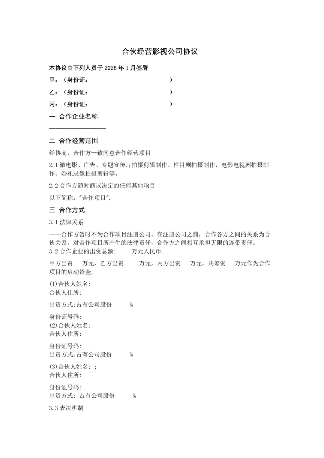 >合伙经营影视公司协议模板,WORD文档电子版,可免费下载打印