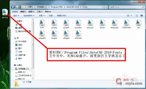 将下好的字体复制到CAD字体文件夹中,CAD字体文件夹路径:C:\Program Files\AutoCAD 2010\Fonts,如果不是安装的C盘的,请到你安装的路径中寻找到Fonts文件夹,把下好的字体gbcbig或者其它字体复制到里面就行了。