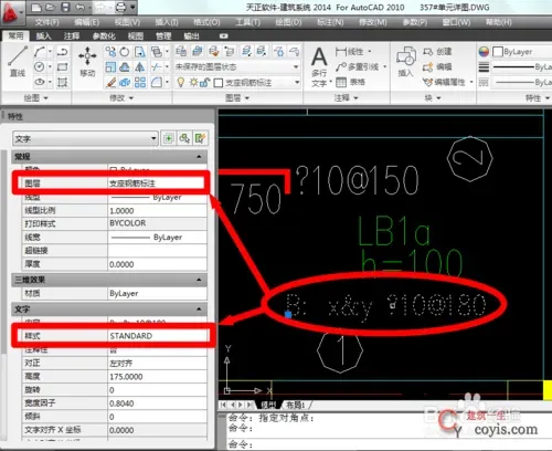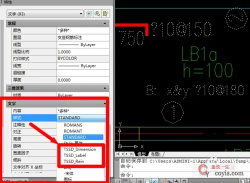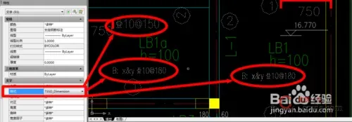 第二步:选中未能正常显示的字,记住它的图层与样式,如图所示,其图层为支座钢筋标注,样式为STANDARD。