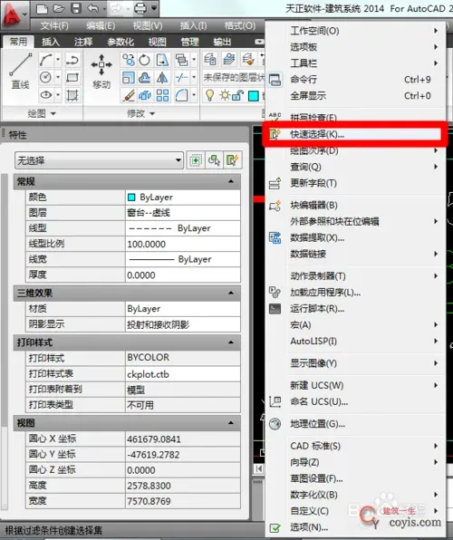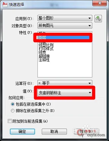 第三步:进行快速选择(可以统一进行设置)。打开工具–快速选择命令(或输入QSELECT),在特性下拉列表中选择图层,在值下拉列表中选择支座钢筋标注。