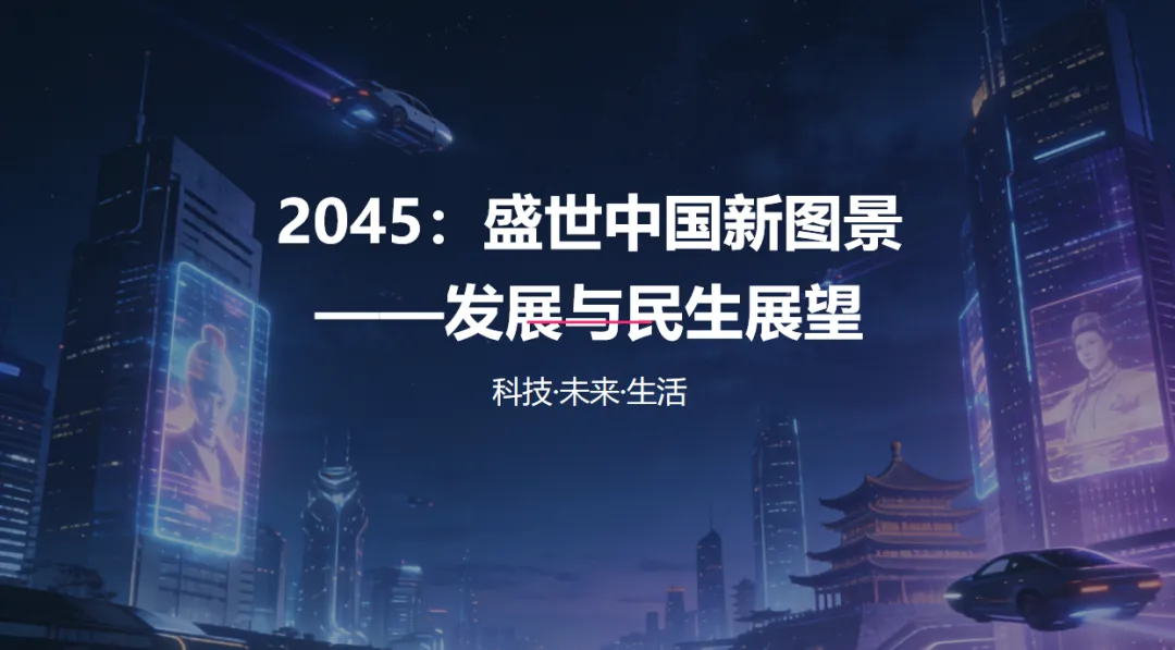 尊敬的各位来宾,大家好!今天我想和大家一起畅想一个充满希望的未来——2045年的中国。彼时的中国,历经数十年的奋斗与积淀,早已在世界舞台上绽放出更耀眼的光芒;彼时的中国人民,也正享受着科技进步、社会繁荣带来的高品质生活。接下来,就让我们一同走进这幅2045年的美好画卷。