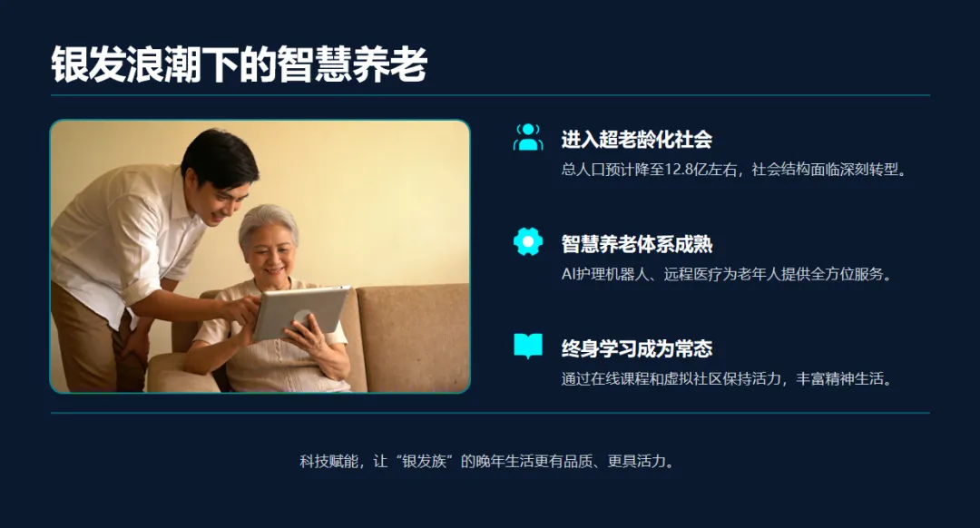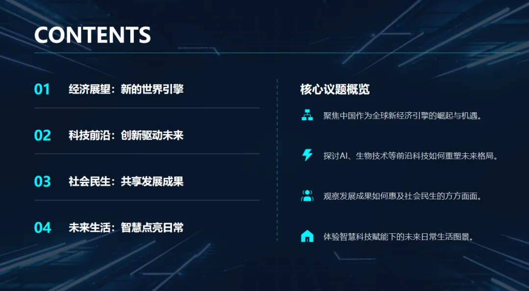 今天的分享将围绕四个核心板块展开。首先,我们会聚焦经济发展新格局,看看中国如何在全球经济中扮演更关键的角色;其次,聊聊科技赋能新生活,那些曾经只存在于科幻片里的场景,如何变成日常;第三,展望社会民生新图景,从教育、医疗到养老,民生保障如何更完善;最后,探讨生态环境新面貌,绿色发展如何成为生活的主旋律。