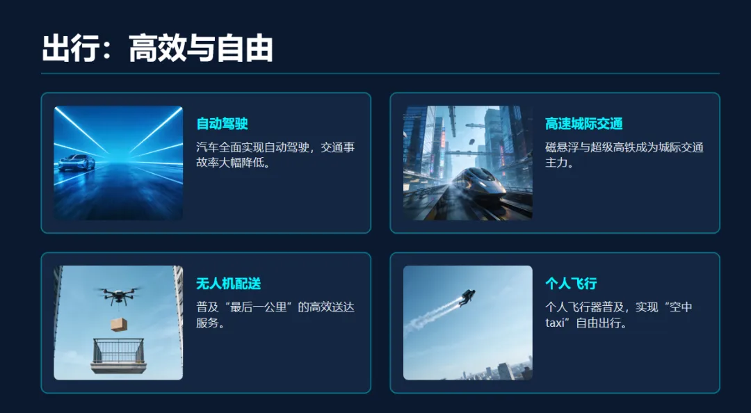 出行方面,自动驾驶汽车普及,智能交通系统让拥堵成为历史,城际之间的高速磁悬浮列车,让“千里江陵一日还”变成了现实。居家生活里,全屋智能系统可以精准感知人的需求,自动调节温度、灯光,智能厨房能根据健康数据定制食谱,甚至自动完成烹饪。