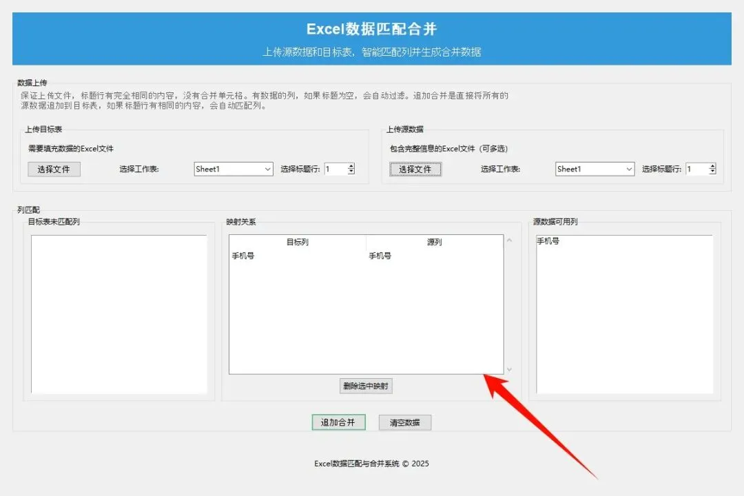 第二步,上传目标数据,也就是需要合并到的Excel数据表格,选择合并到哪个工作表,标题行。