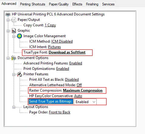 将 TrueType 发送为位图:启用,强制以位图形式传递字体数据,绕过驱动字体解析。