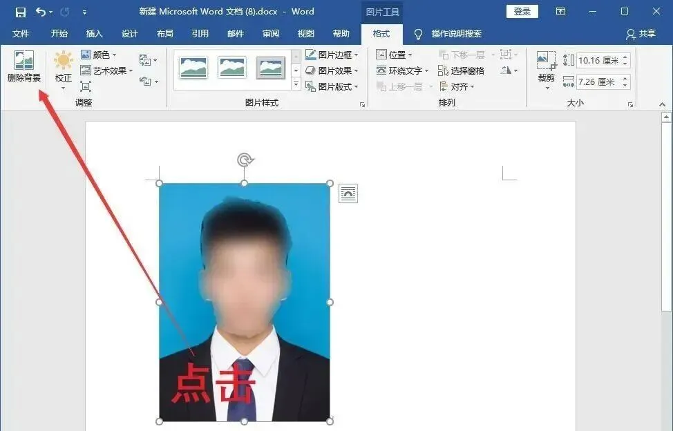 ①打开电脑在桌面新建一个Word文档,插入我们的照片,然后双击图片,点击左侧的【删除背景】。