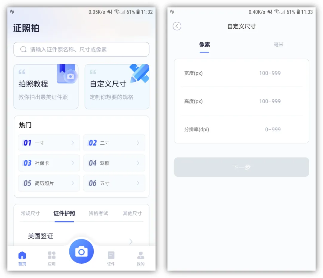 ①出门在外身边没有电脑,用手机也可以制作证件照,需要借助【证照拍】,里面有几十种规格尺寸,例如:一寸、二寸、社保卡、简历照片等,或者自定义尺寸。