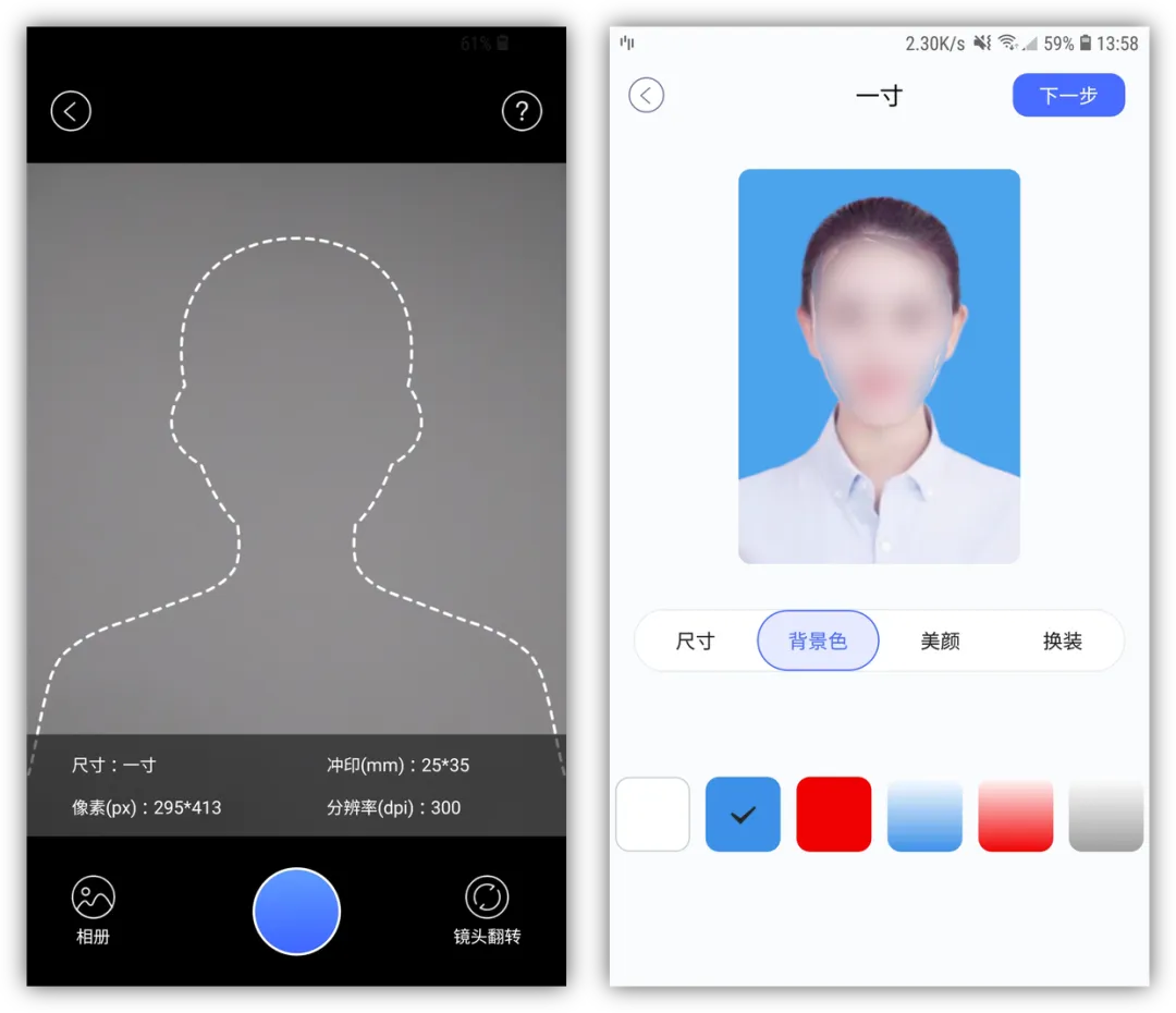 ②选择好照片规格后,自动打开相机,对准屏幕上的人像虚拟框,拍下自己的照片,随后自动生成证件照,照片背景任你切换,提供了白、蓝、红、渐变色。