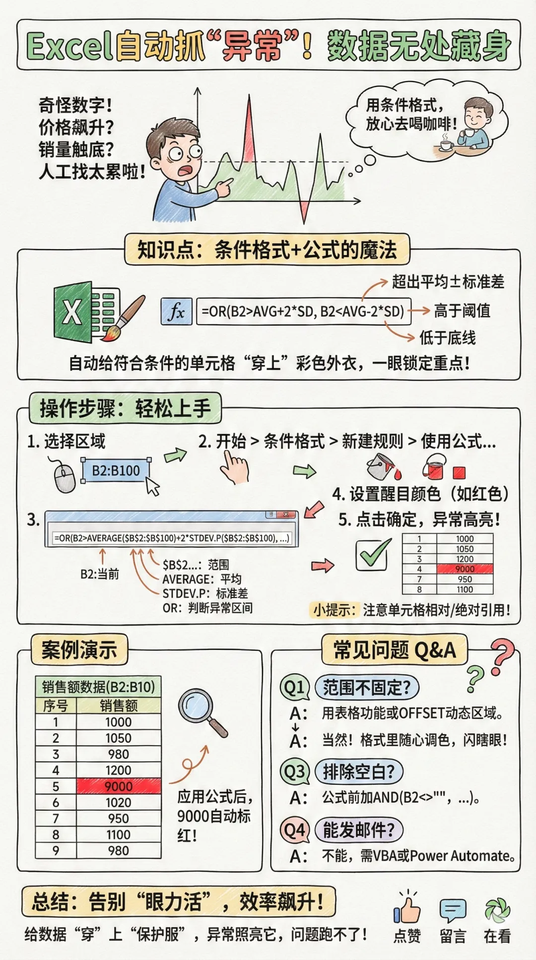 总结内容:用条件格式+公式自动标记异常数据,轻松告别“眼力活”,职场效率直接飙升!快把你的数据“穿”上千变万化的“保护服”,异常照亮它,问题跑不了~