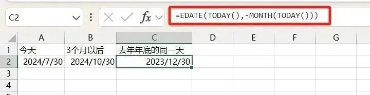 进阶技巧:若想找到去年年底的同一天(如7月30日对应去年12月30日),可使用:=EDATE(TODAY(), -MONTH(TODAY()))3. 注意事项