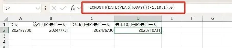 公式:=EOMONTH(DATE(YEAR(TODAY())-1, 10, 1), 0)公式解析:先用DATE函数构造出去年10月1日这个日期,再用EOMONTH求该月的最后一天。