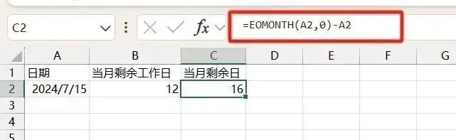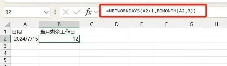 需求:从今天(2024年7月15日)起,到7月底还有多少个工作日?公式:=NETWORKDAYS(A2+1, EOMONTH(A2, 0))解析:A2+1表示从第二天开始计算,EOMONTH(A2,0)确定月末日期,NETWORKDAYS自动排除周末。2. 计算当月剩余总天数