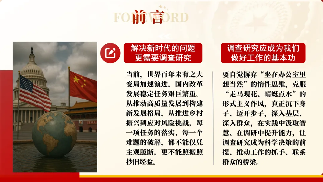 这份专题辅导聚焦调查研究的核心要义,从中华传统文化中的求实智慧到*的百年调研实践,从***的率先垂范到实操方法技巧,全方位拆解如何把调查研究搞扎实。无论是破解发展堵点、回应民生关切,还是锤炼工作本领、筑牢群众根基,都能在这里找到科学指引。