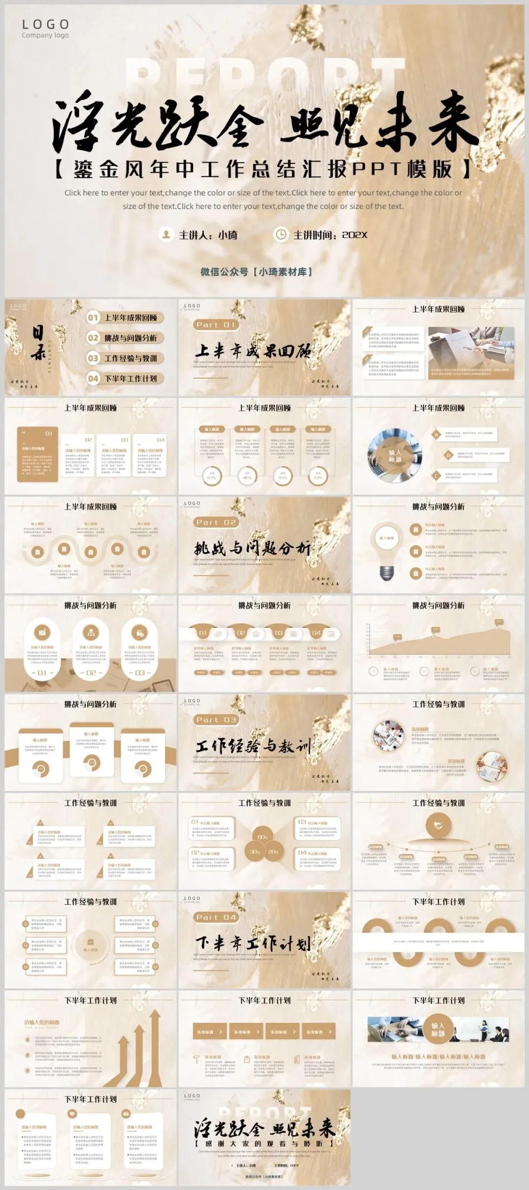 告别千篇一律的简约白,轻奢鎏金风PPT模板以其独特的金属质感、低调的奢华气场和细腻的设计细节,正成为越来越多追求卓越人士的首选。适用于工作总结汇报、商业计划书等等!