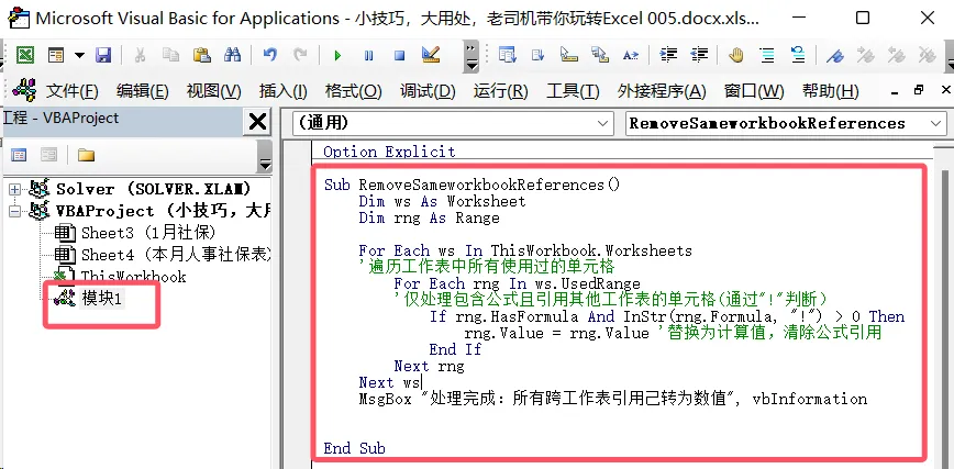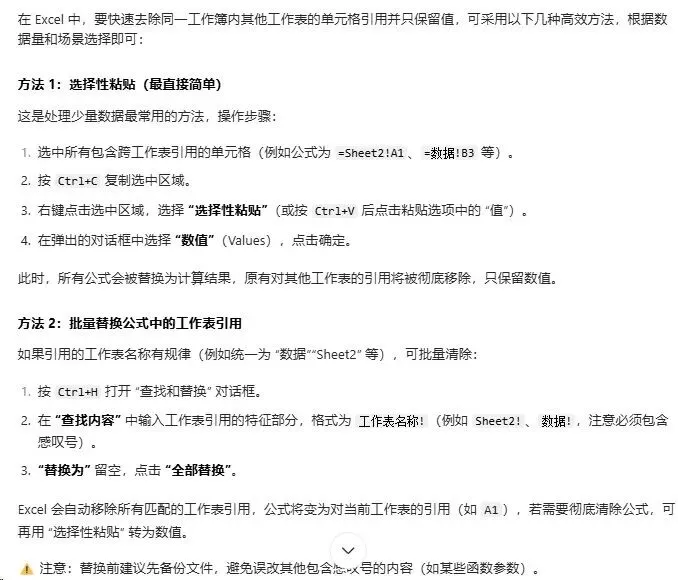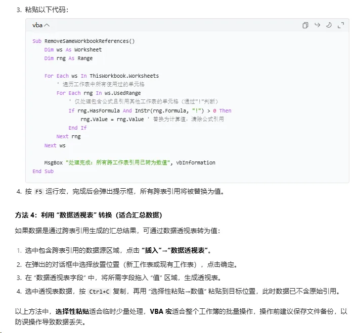 那如果是同一个工作簿内引用了其他工作表中的数据,怎么办呢?如下图,在【员工社保表】中引用了同一工作簿中的其他工作表(本月人事社保表)中的数据。如果引用其他工作表数据不多,而且是连续的单元格区域,可以使用上面介绍的方法,直接复制粘贴即可。比如:像这些【单位小计】,【个人小计】,以及【总计】。通过创建独立工作簿将内部引用转换为外部引用,从而使断开【工作簿链接】的功能可以正常使用。❶ 右键依次点击【本月人事社保表】-【移动或复制】。在【工作簿】下拉选项中,选择(新工作簿),然后点击【确定】。原来表中引用的【本月人事社保表】中的数据也会随之发生变化。需要全部中断的话,可以点击上方的【全部中断】按钮。当然了,AI 时代,如果你在使用 Excel 时遇到了问题,问问 AI 其实也是个不错的选择。在Excel中,如何快速去除引用同一工作簿内其他工作表中的单元格,只保留值?第三种是用 VBA 代码实现,我们来测试下是否正确。在【开发工具】中点击【Visual Basic】进入 VBA 窗口。然后【插入】-【模块】,把豆包生成的代码复制进去,按【F5】运行代码。经过查看,都已经转换为数值了,说明 VBA 代码是正确的。今天我们介绍了 3 种快速去除工作表中的引用的方法。还尝试了借助 AI 工具处理问题,比如:我们将问题和需求(尽量完整详细的写出来)发给豆包。就会得到一种或者几种非常全面和详细的解决方案,我们可以选择性的参考使用,工作效率会大大提升。不满意给出的答案的话,还可以继续提问,它也会不厌其烦的回答你。但如果你不懂提问逻辑,反而需要花费大量时间去「调教」AI,结果还未必准确