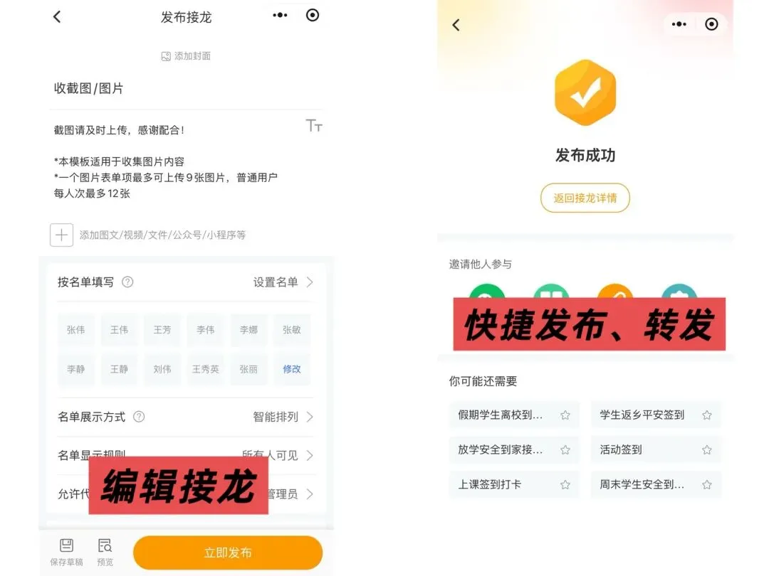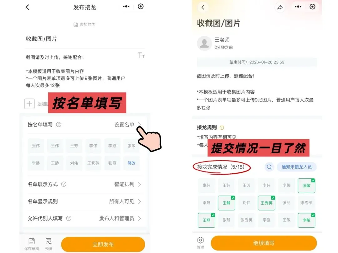 接龙管家有 “按名单填写” 功能 —— 提前把成员名单录进去,填的时候点名字提交,提交过的名字会 “点亮”,谁漏填一眼就看到,再也不用手动统计 “催作业”!