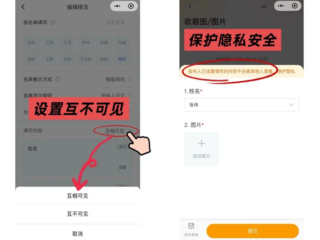 传统接龙最坑的是:填的手机号、身份证号全在群里裸奔!接龙管家能设 “内容互不可见”