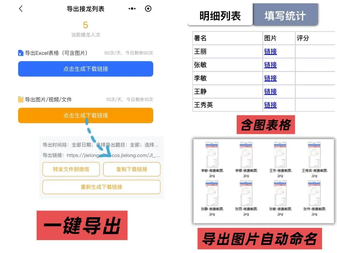 最香的是 —— 用接龙管家收的数据,能一键导出 Excel 或压缩文件!导出时自动按姓名匹配内容,文件名还能自动生成(比如 “爬山活动报名 202508”),不用手动重命名、分类,整理数据从 “1 小时” 变 “1 秒”!