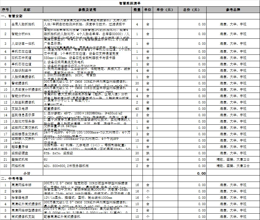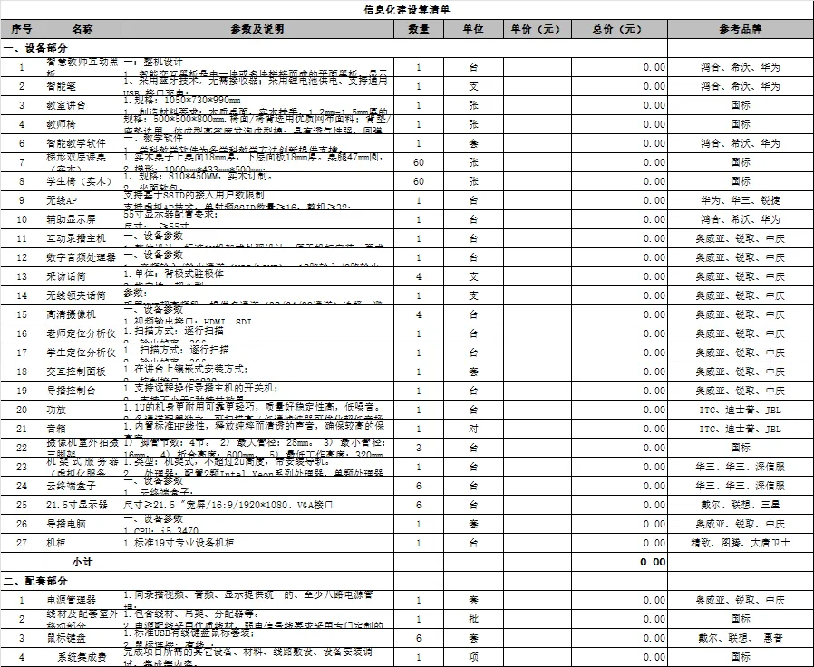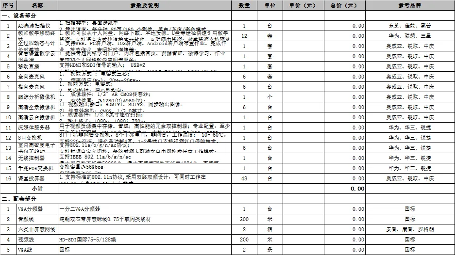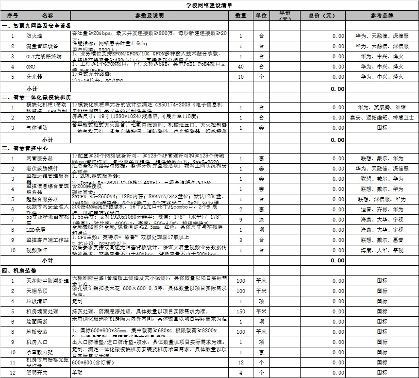 清单分 4 大板块(网络改造、智慧教学、监控直录播、校园安全),包含 15 项核心系统:从校园网络线路改造、机房集成,到智慧教室建设、多媒体设备,再到校园安防、物联系统,覆盖了智慧校园的全流程需求,且以 Excel 格式呈现,支持根据学校规模、预算灵活调整。