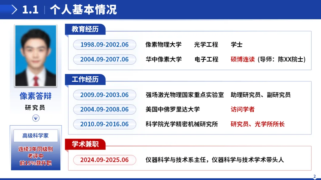 开篇用简洁的时间线呈现教育经历、工作履历,搭配学术兼职亮点,快速建立专家对个人资历的认知。重点突出关键节点:如硕博导师背景、海外访学经历、核心岗位任职情况,让 “硬资历” 先声夺人。