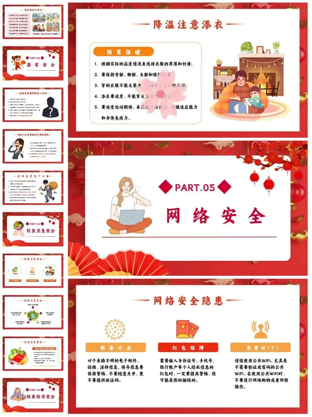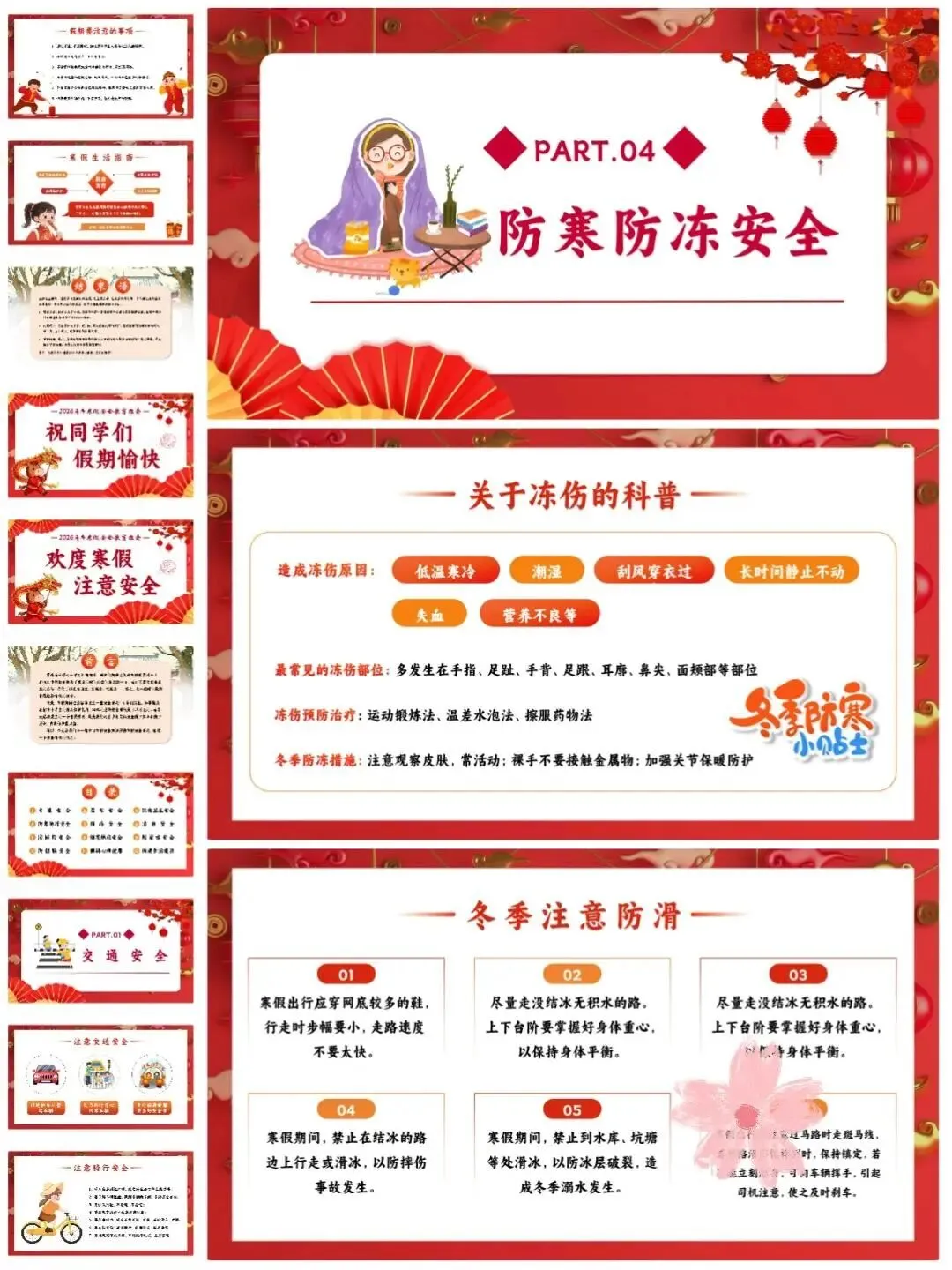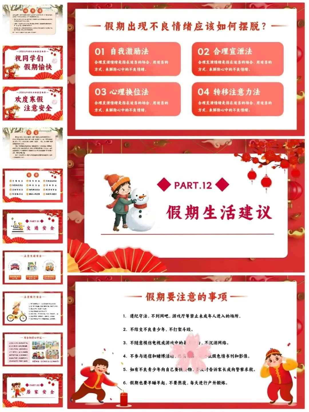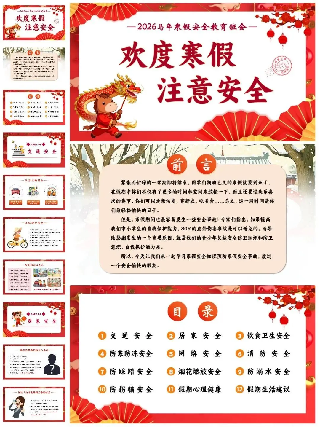 [仙女R]临近假期,安排寒假安全教育班会[打卡R],学生们一起学习安全知识[红书R],让这个寒假过得既快乐又安心![点赞R] [向右R]班会PPT一共有12个重要部分,分别是:交通安全、居家安全、饮食卫生安全、️防寒防冻安全、️网络安全、消防安全、️防踩踏安全、烟花燃放安全、️防溺水安全、防拐骗安全、️假期心理健康、假期生活建议。