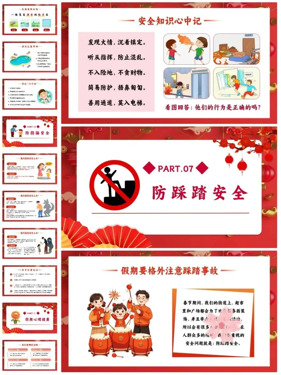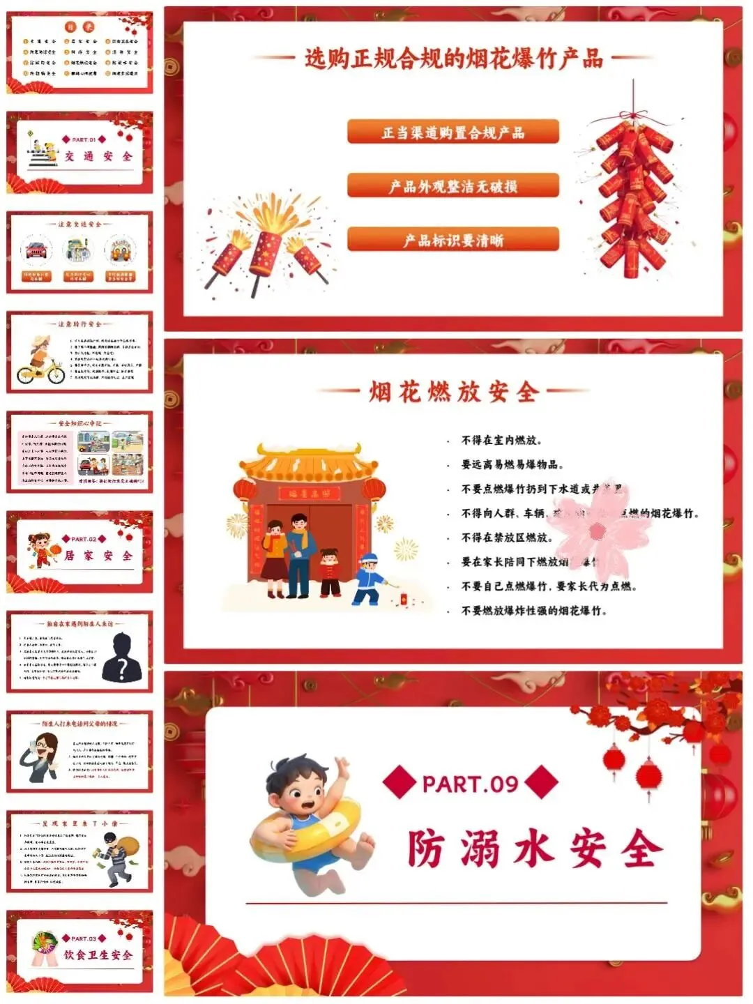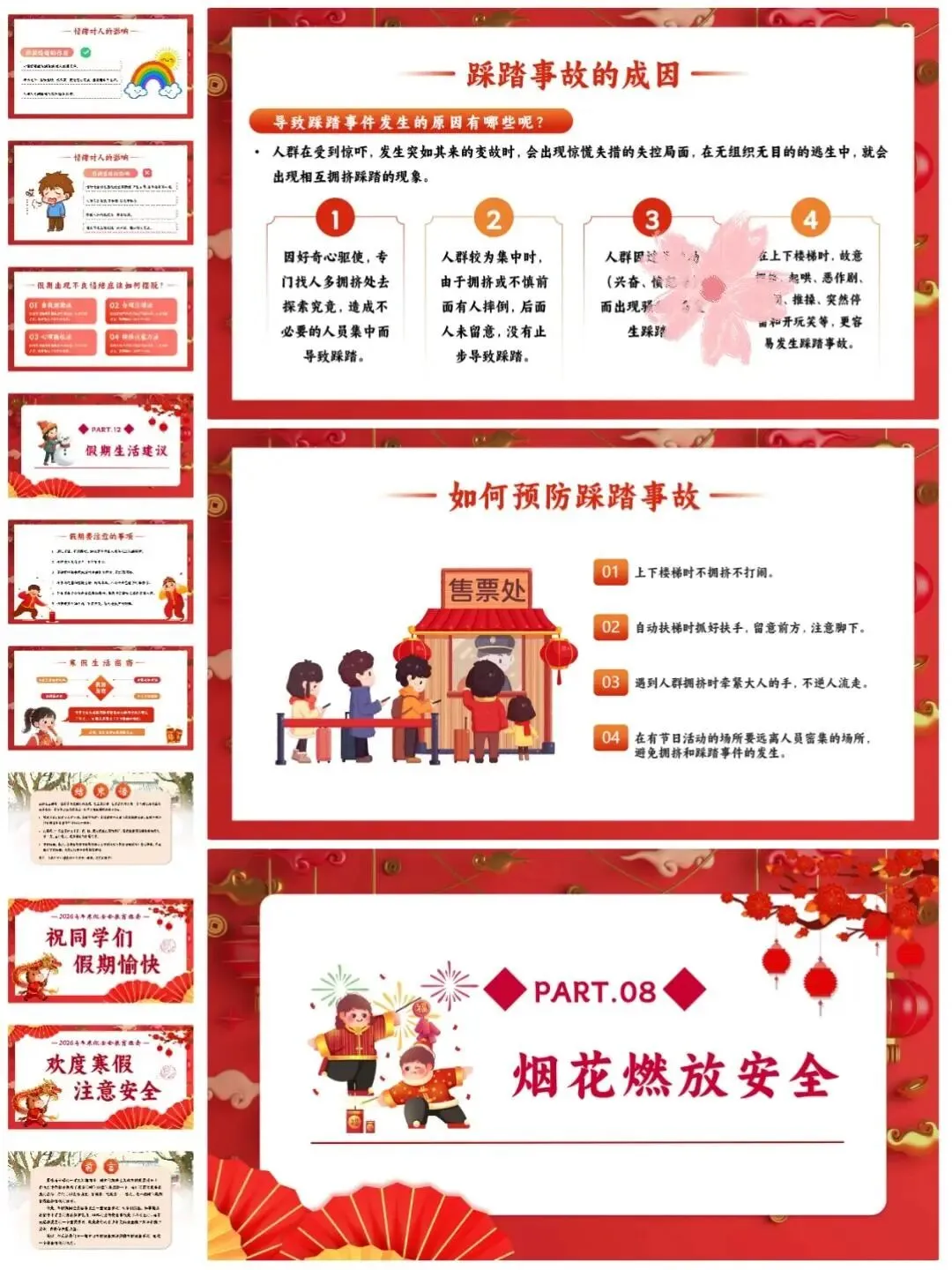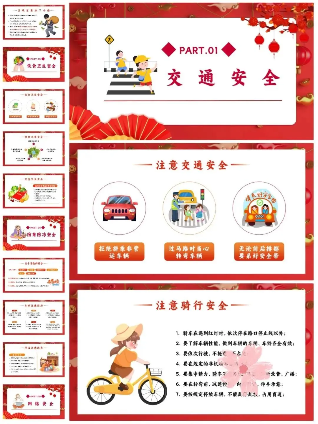 [仙女R]临近假期,安排寒假安全教育班会[打卡R],学生们一起学习安全知识[红书R],让这个寒假过得既快乐又安心![点赞R] [向右R]班会PPT一共有12个重要部分,分别是:交通安全、居家安全、饮食卫生安全、️防寒防冻安全、️网络安全、消防安全、️防踩踏安全、烟花燃放安全、️防溺水安全、防拐骗安全、️假期心理健康、假期生活建议。
