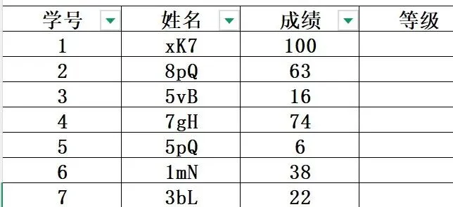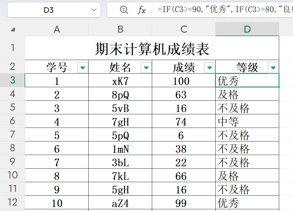 在学校已经考完计算机科目,你有这样一个期末成绩表:需要用函数计算每个学生的等级要求:成绩≥90为优秀, 90>成绩≥80为良好, 80>成绩≥70为中等, 70>成绩≥60为合格,成绩<60为不及格。