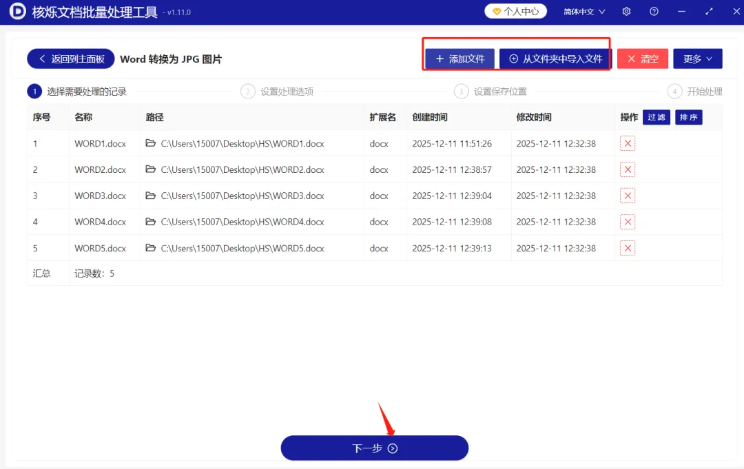 2.将要处理的word文件导入到界面中,可以选择【添加文件】或者【从文件夹中导入文件】,也可以一键选中多个文档直接拖拽到处理框中,导入后点击【下一步】即可。