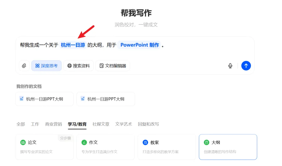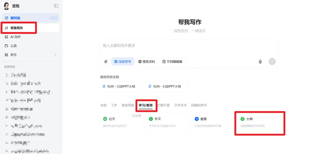 在左侧找到**"帮我写作",选择学习/教育里的"大纲"**。