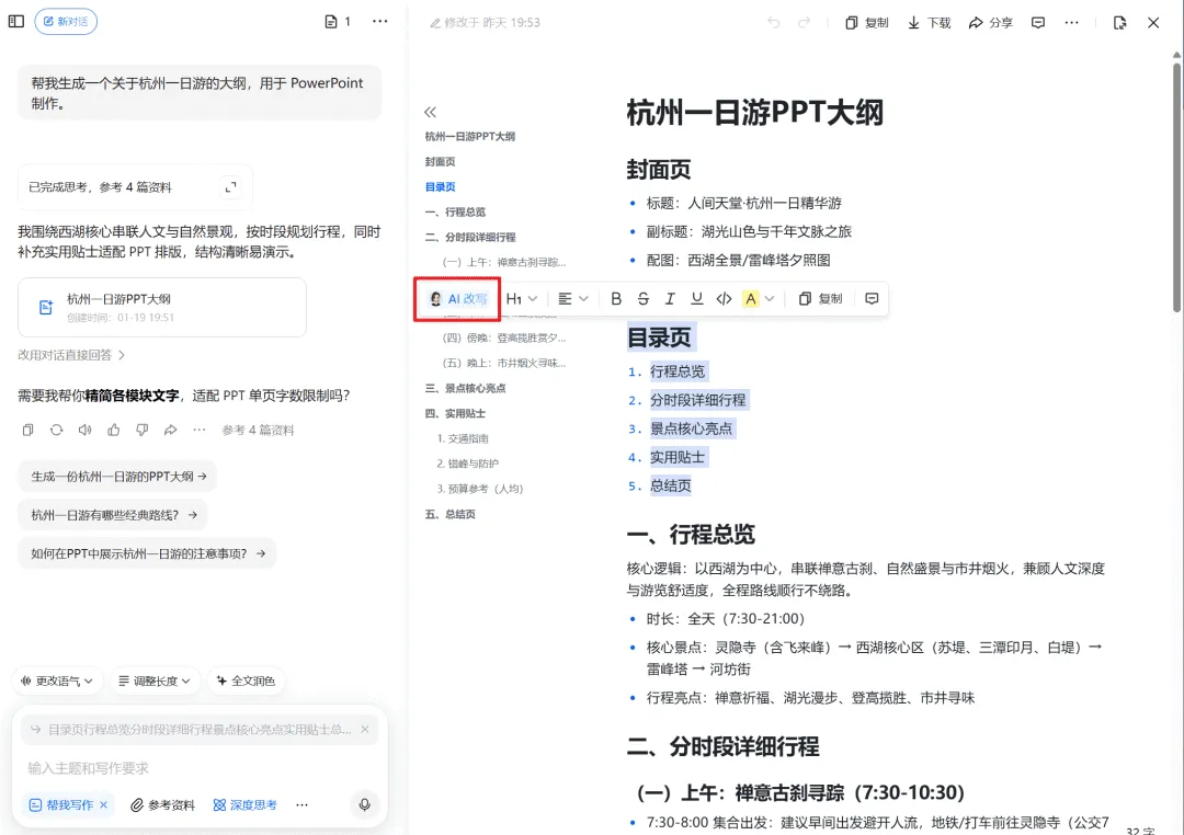 等它出大纲后,你可以直接改;觉得不顺的地方,选中那段,点**"AI改写"**,它会帮你优化得更顺更像人话。