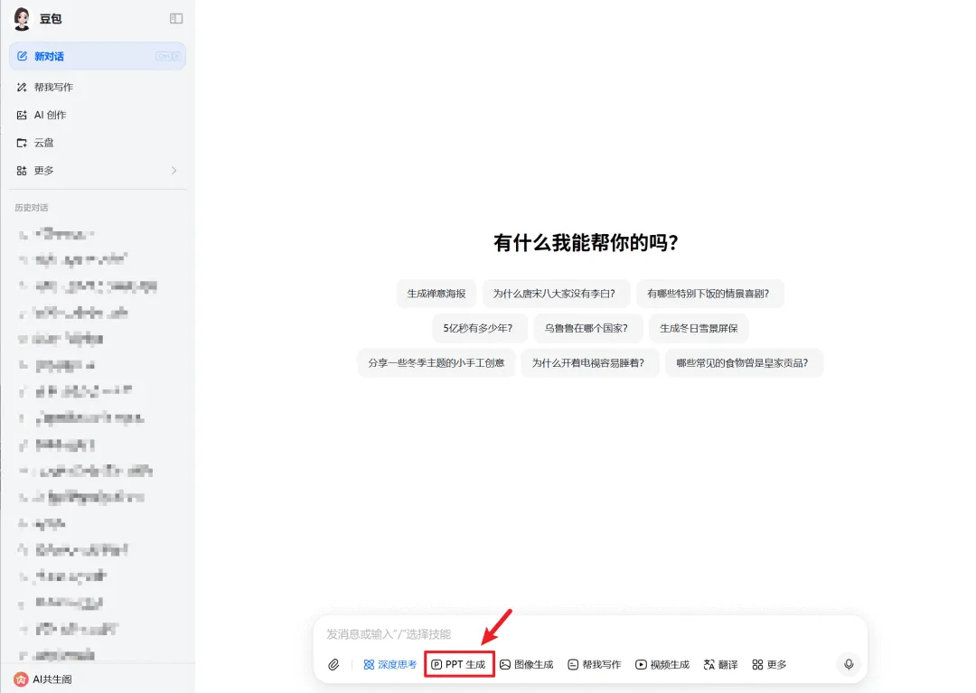 2026-01-20-22-44-49回到左侧顶部开一个新会话,在输入框下面找到**"PPT生成"(如果没看到,就点更多**展开)。