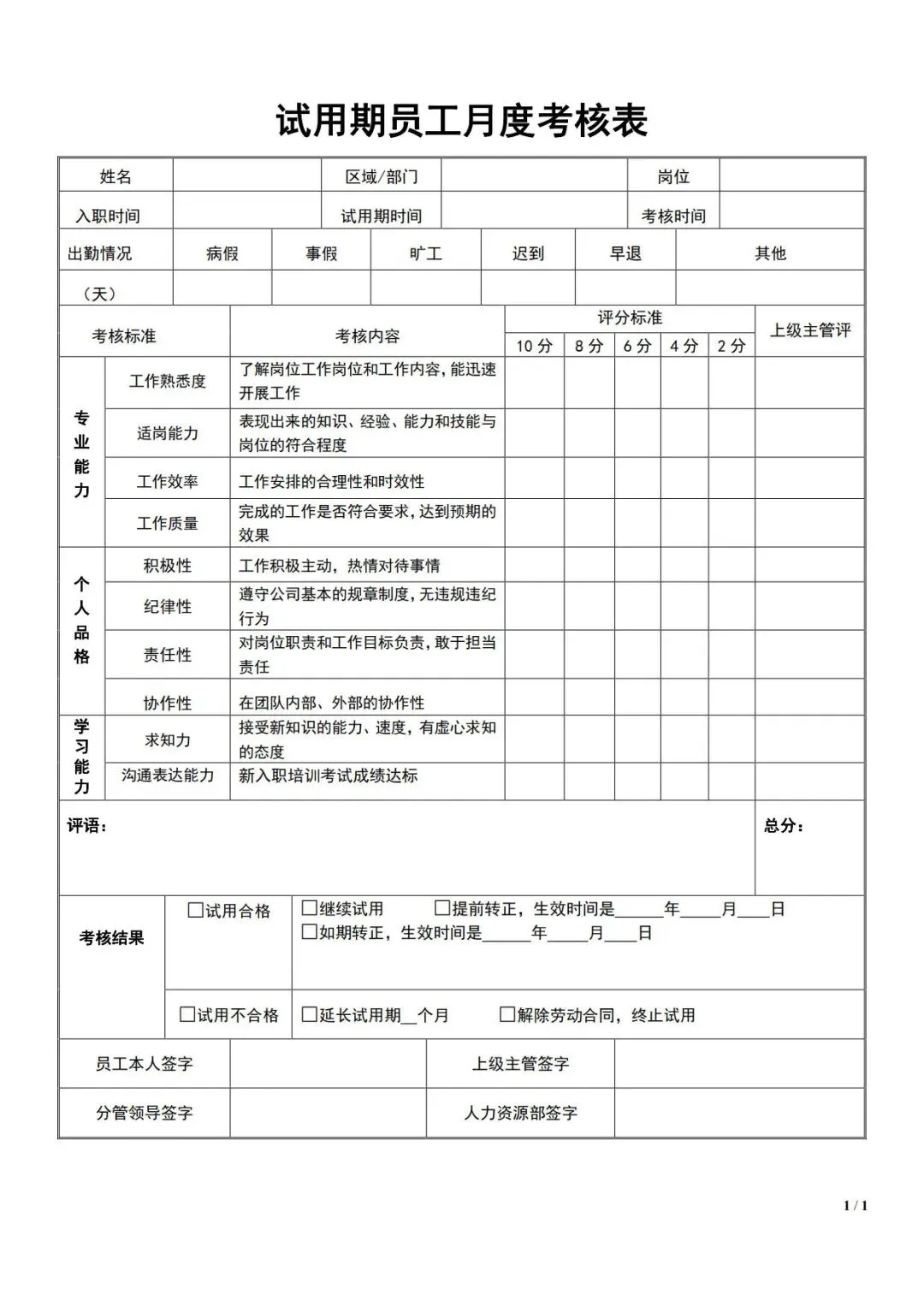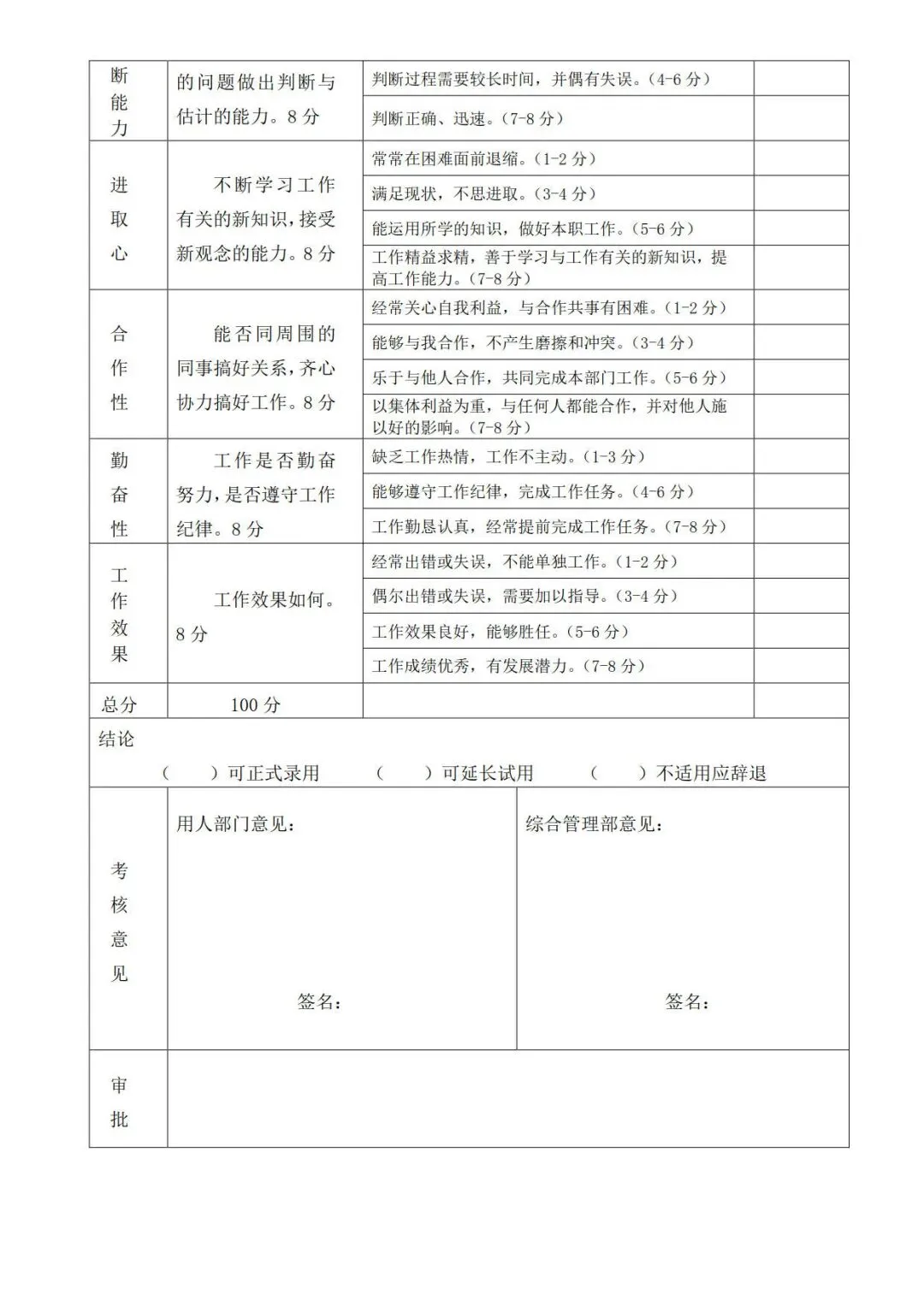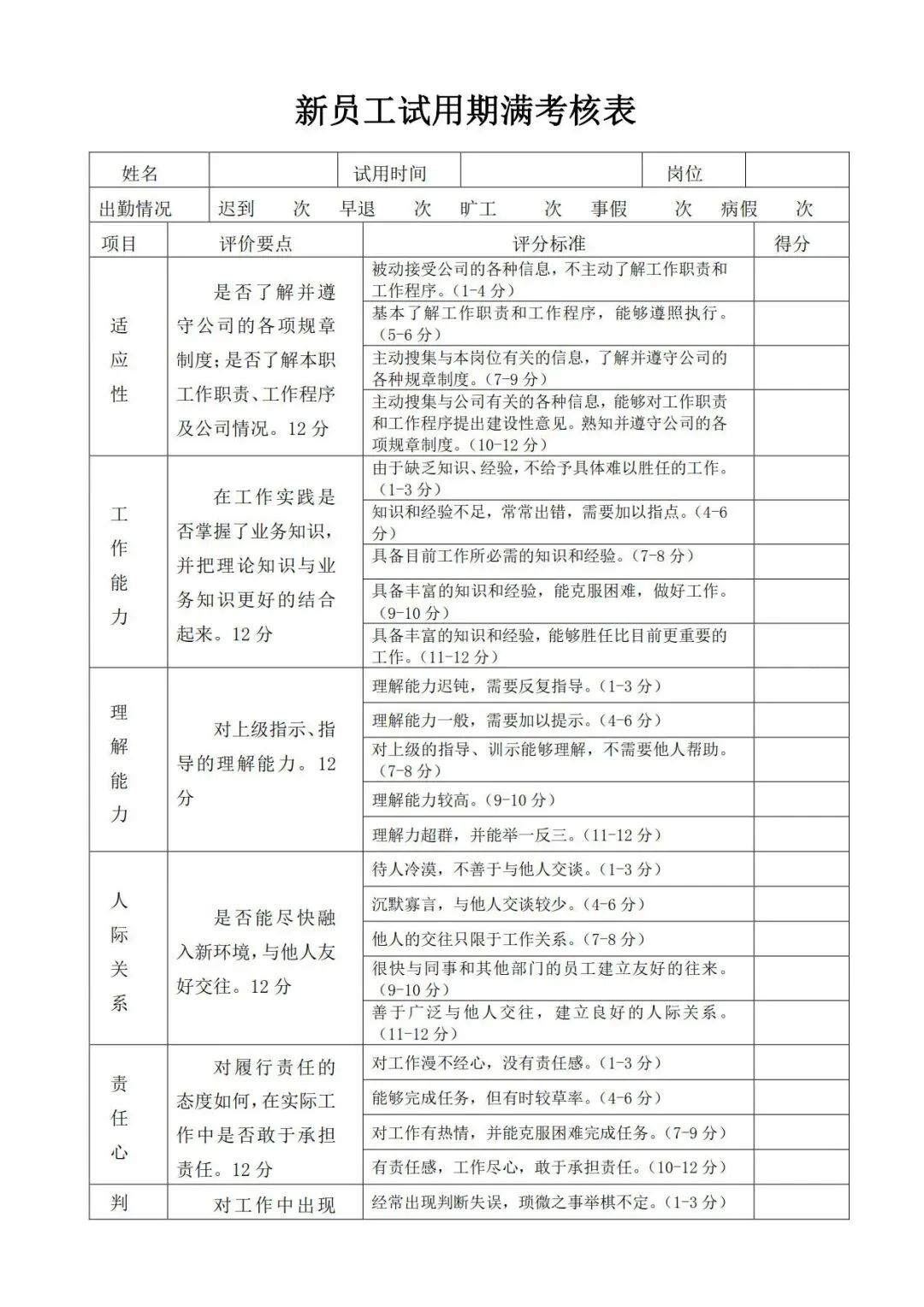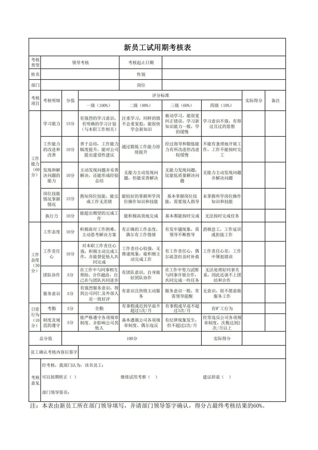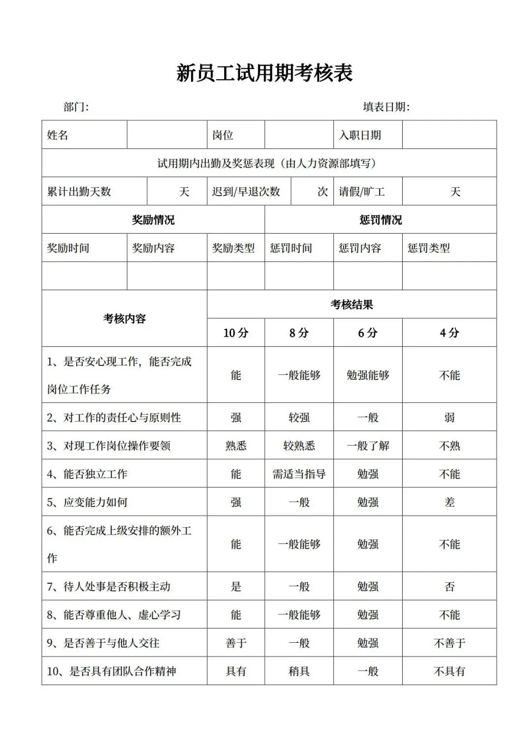 4款新员工试用期考核表模板,WORD文档电子版,可免费下载打印
