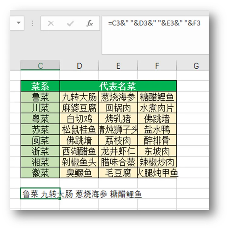 如下图输入公式=C3&" "&D3&" "&E3&" "&F3,按下回车键,完成多个单元格内容合并。再选中合并好内容的单元格,下拉复制,即可完成所有内容的单元格内容合并。