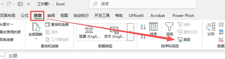 首先我们先看看它在哪个位置,数据->排序和筛选->高级