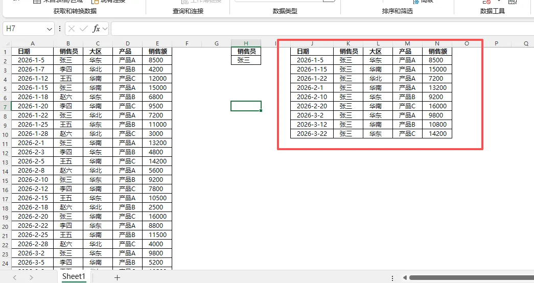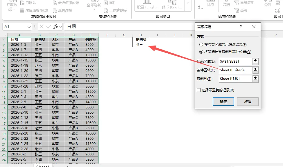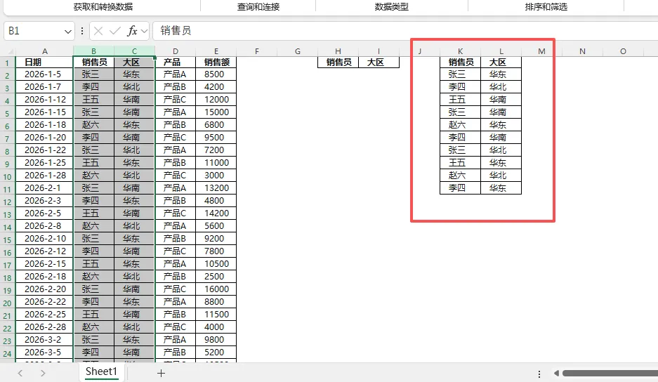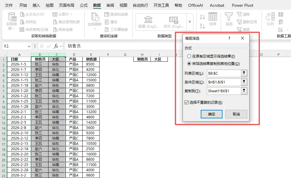 我想提取销售员+大区不重复的数据,只需点击高级,将列表区域选为:B1:C31,条件区域选为H1:I1,复制到J1,勾选选择不重复的记录。