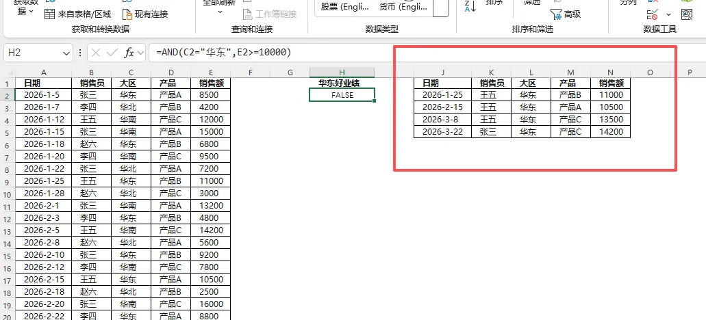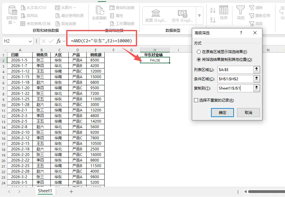 =AND(C2="华东",E2>=10000),然后选中表格中任一单元格,点击高级就会自动选中区域,然后将条件区域选为H1:H2,复制到J1。
