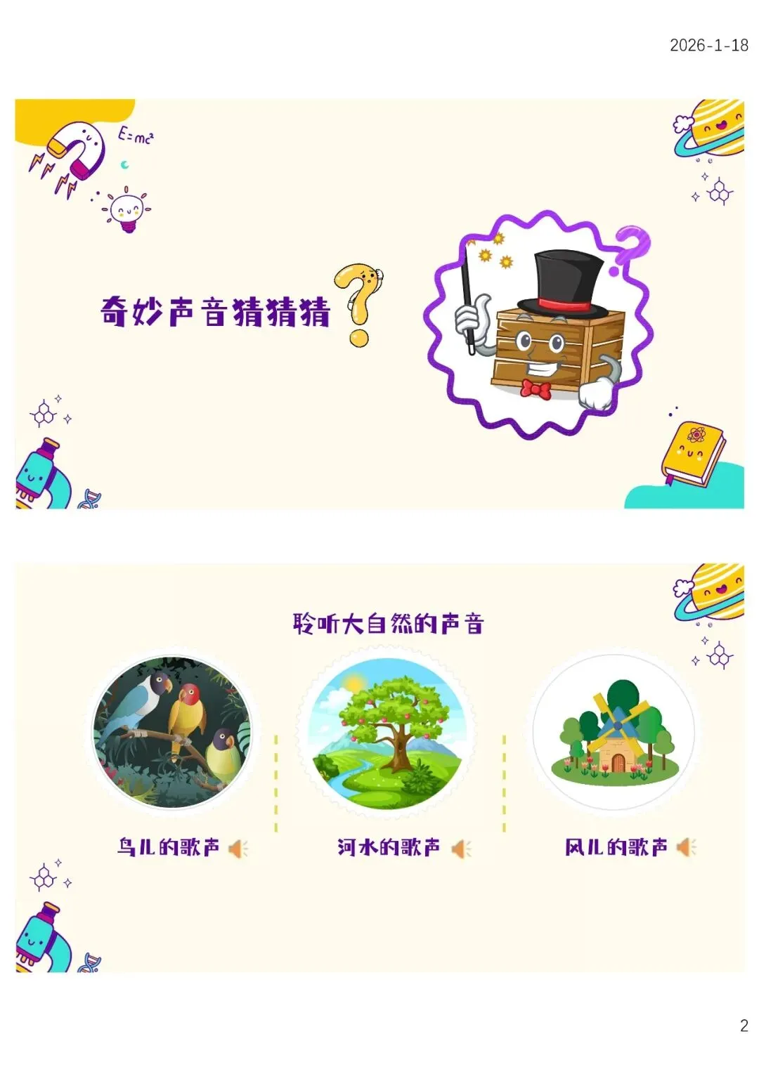 《声音的秘密》这一活动的设计初衷源于观察到孩子们日常生活中对各种声音现象的好奇与疑问。在幼儿的世界里,声音无处不在——从鸟儿的鸣叫、风声、流水声到日常生活中的铃铛声、鼓掌声等。然而,尽管这些声音频繁地出现在他们的周围,孩子们往往并不了解这些声音是如何产生的。例如,当孩子们听到铃铛发出的声音时,他们可能会问:“为什么摇动铃铛就会有声音?”或者“不同的东西为什么会发出不同的声音?”这些问题反映了孩子们对于声音背后原理的自然好奇和探索欲望。