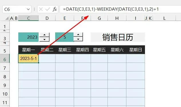 =DATE(C3,E3,1)-WEEKDAY(DATE(C3,E3,1),2)+1