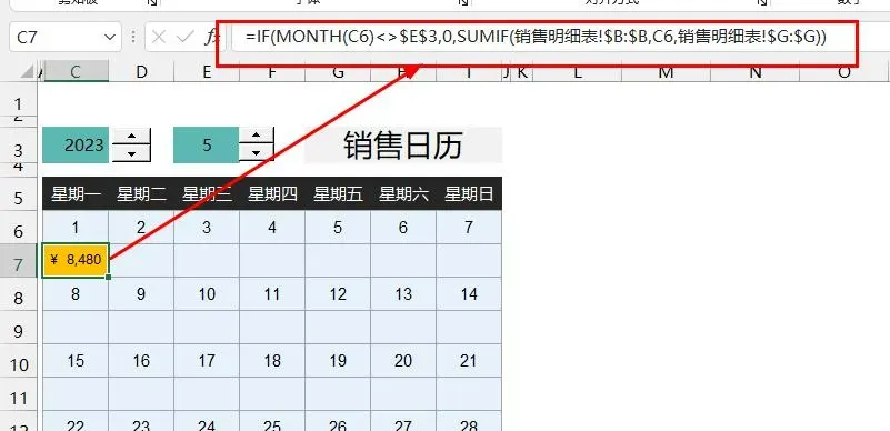 =IF(MONTH(C6)<>$E$3,0,SUMIF(销售明细表!$B:$B,C6,销售明细表!$G:$G))