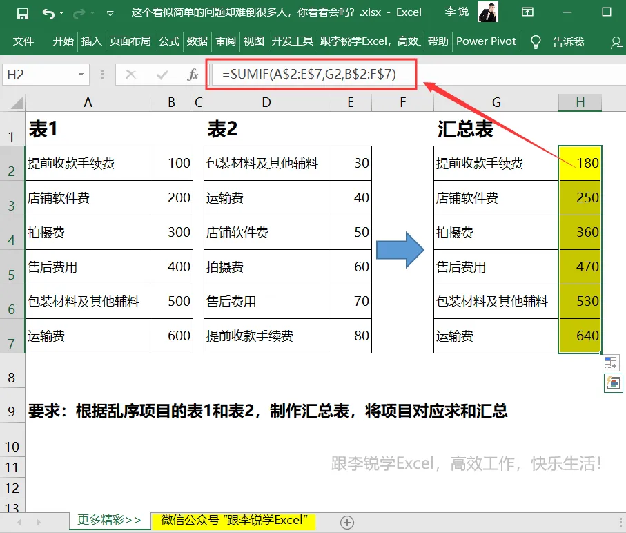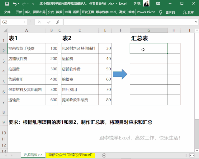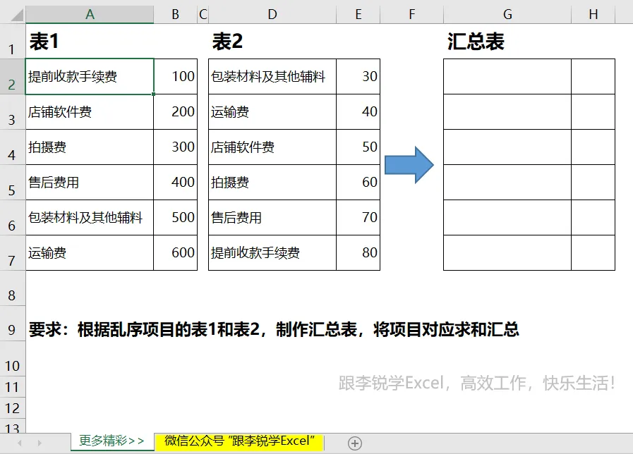 要求:汇总表中要按照各个项目求和汇总对应的项目费用之和,要注意左侧原始数据中项目是乱序排列的。